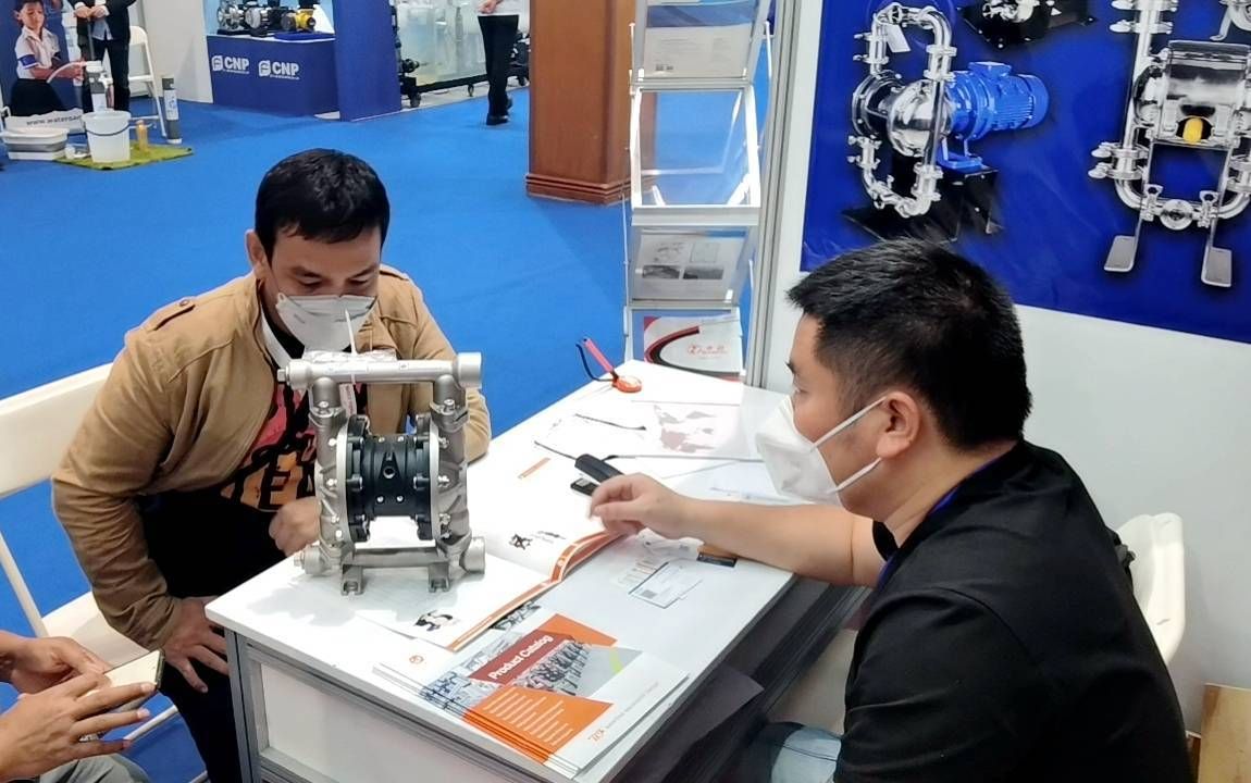 2022年10月5日,在国庆假期即将结束之际,边锋集团国际事业部的同事们在结束泰国的旅程后,又闪现至印度尼西亚的雅加达会议中心,携气动隔膜泵、电动隔膜泵、卫生级隔膜泵、插桶泵等一众新老产品亮相“2022年印度尼西亚水处理展览会”。